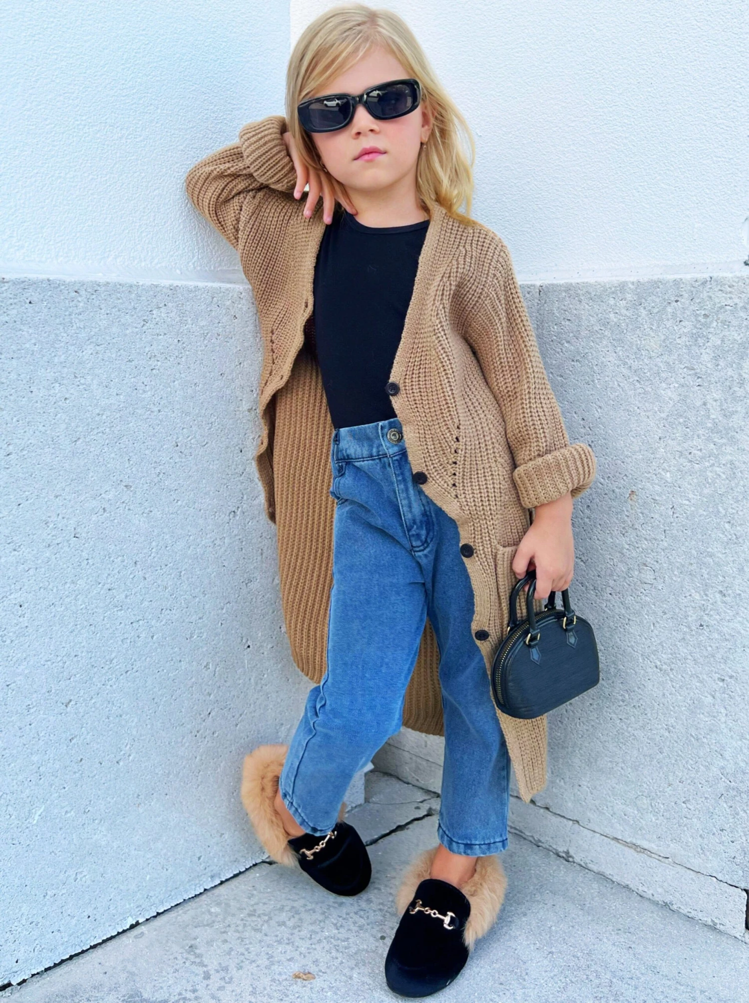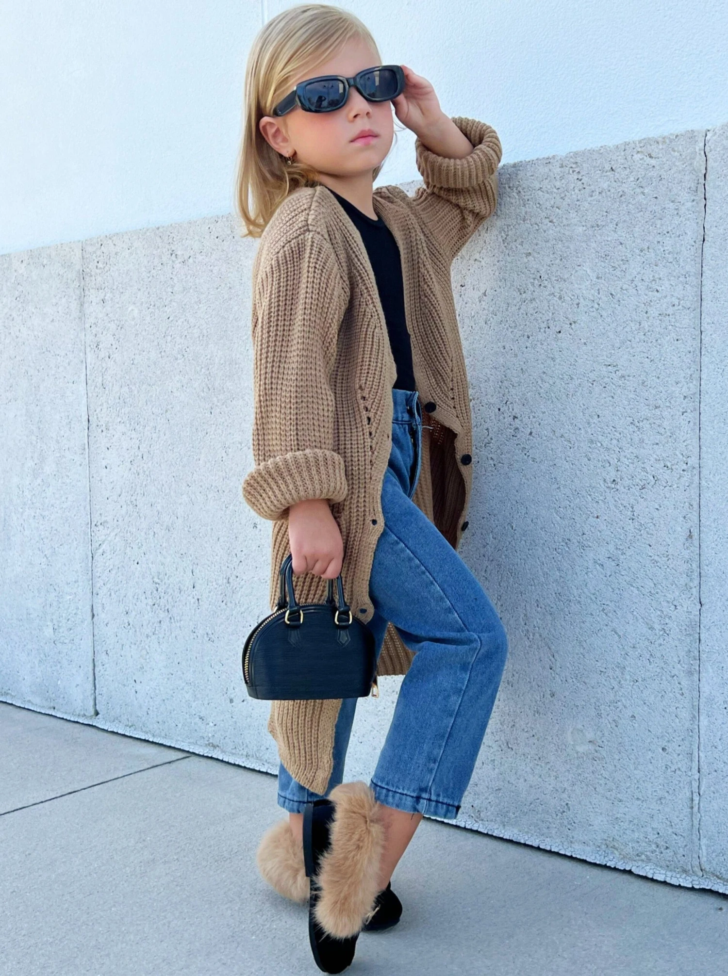 - Whether she is snuggling up or adventuring outdoors, our oversized knit cardigan is a must-have piece for your little trendsetter. Treat her with a Mia Belle piece that delivers both style and comfort. She definitely deserves it!