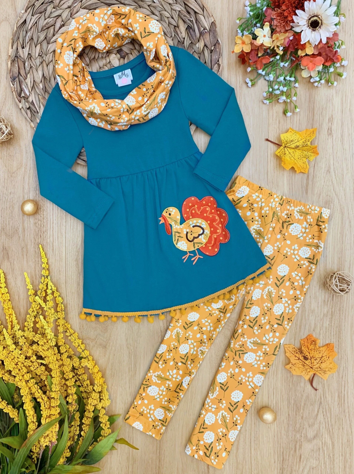 - Long-sleeve blue tunic with pom-pom hem and turkey applique, floral print leggings with a matching infinity wrap scarfÂ