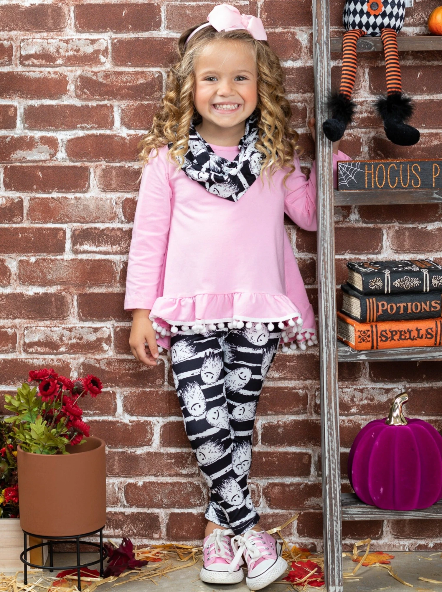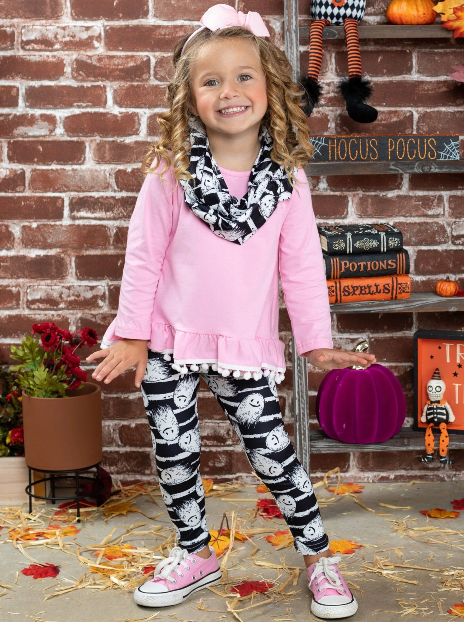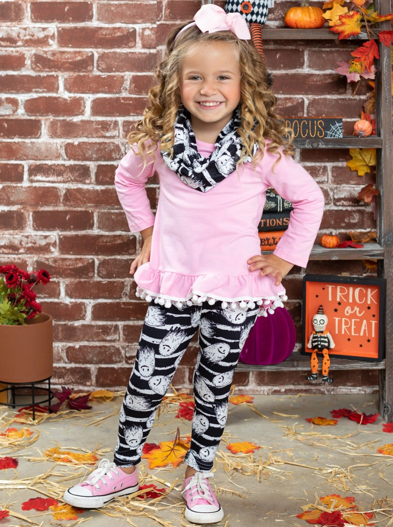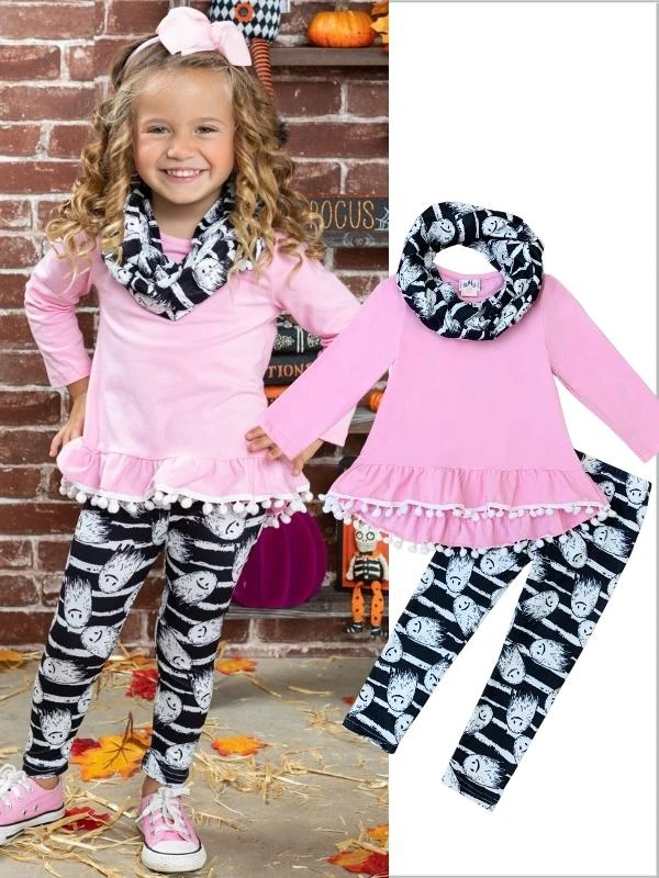 - Make the spooky season oh-so-special for your BOO-tiful girl with this festive three-piece set to look stylish in. Little ghosts and chic stripes will have her counting down the seconds till it’s time to trick-or-treat.