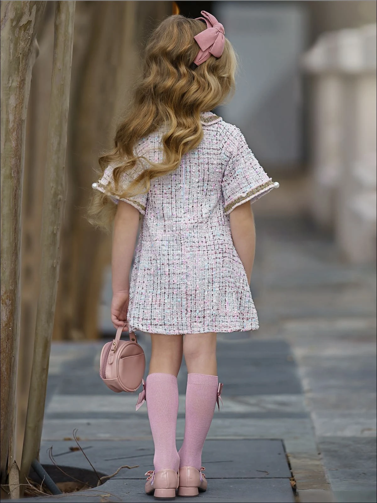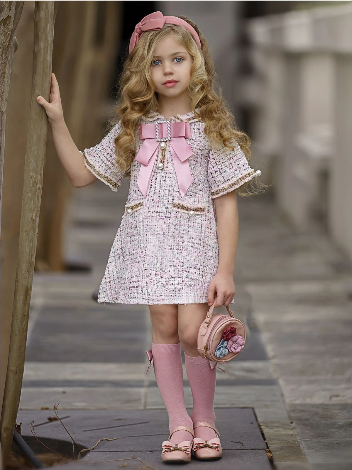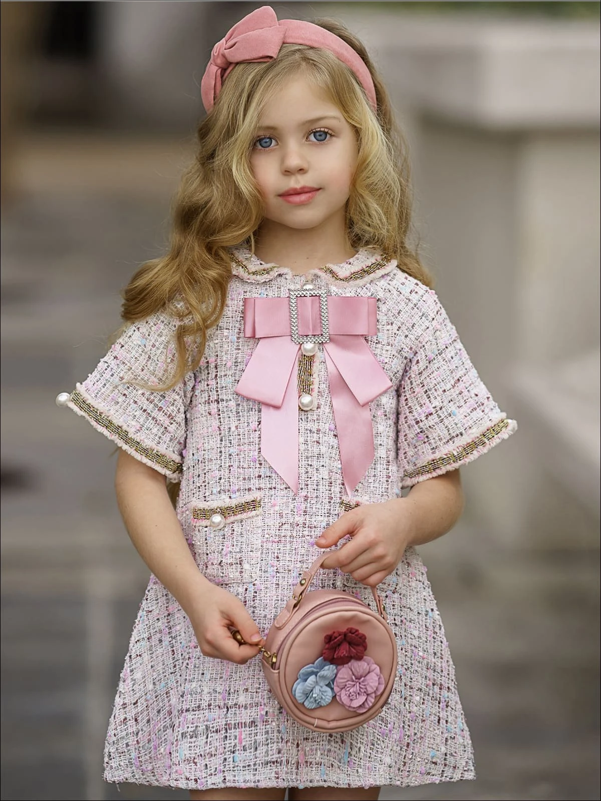 - Your spring princess will never take this off! Featuring charming details like a removable pink bow, pearls and sequin embellishments, it’s the perfect tweed dress for your little sunshine.Â